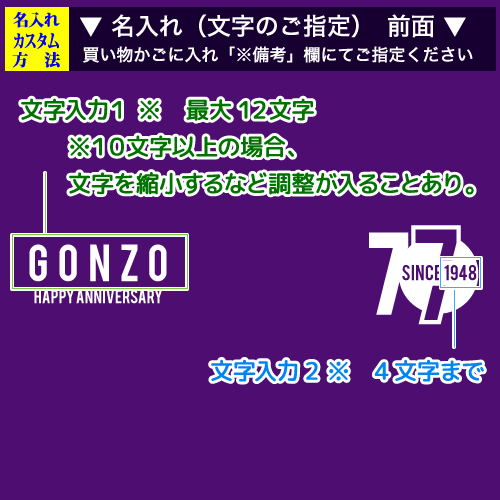 文字入力1:前面のテキスト「HAPPY ANNIVERSARY」の上の文字(お名前など) ※半角9文字目安(9文字以上の場合文字の縮小調整する場合があります) ※英数字で指定してください(大文字でプリントとなります) GONZO ↓ (GONZO) 文字入力2: 前面の数字「77」の中(お生まれ西暦年) ※半角4文字まで ※数字で指定してください SINCE 1944 ↓ SINCE (1944) △ココまで………………………………………… ………………………………………………………………………… ★